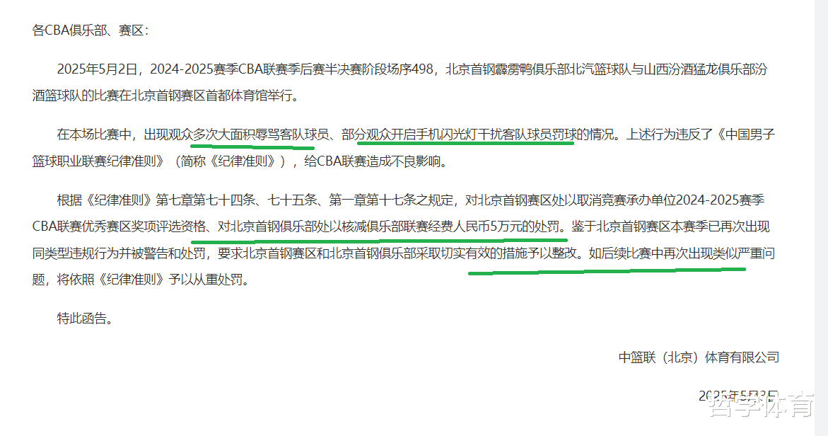 与此同时,CBA公司调查发现,北京队球迷还做出了用手机闪光灯干扰山西队球员罚球的情况,这样的行为,同样是违反了CBA的《中国男子篮球职业联赛纪律准则》,影响了CBA联赛的形象。