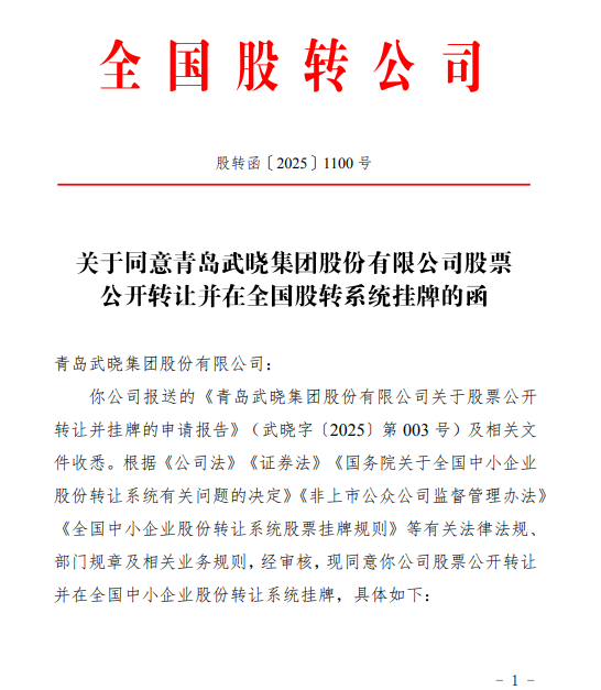 好消息!近日,青岛武晓集团股份有限公司正式获批登陆新三板基础层,成为青岛市年内继力克川、华晟智能、斯坦德之后第4家新三板挂牌企业。