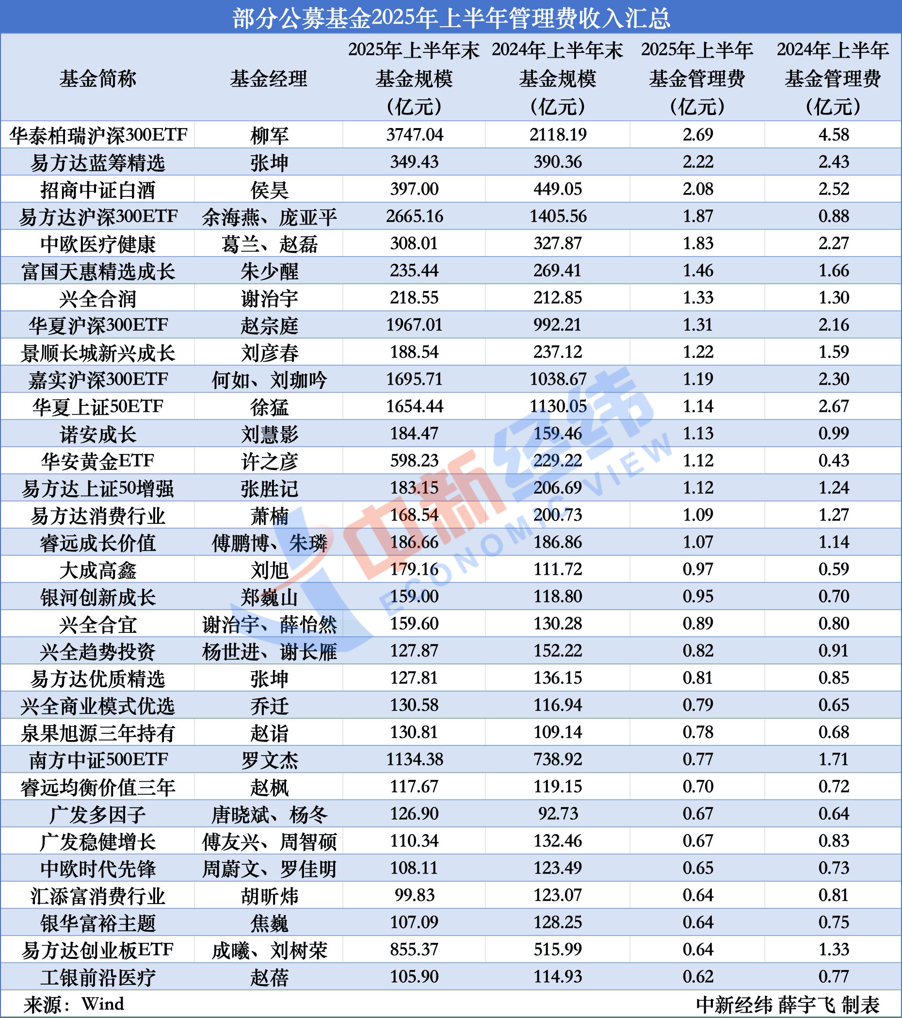 基金经理柳军管理的华泰柏瑞沪深300ETF,是当前市场规模最大的ETF产品。尽管该基金的规模较2024年上半年末增加超1600亿元,但由于年管理费率由0.5%降至0.15%,管理费收入由2024年上半年的约4.58亿元,降至2025年上半年的约2.69亿元,同比降幅约41.12%。