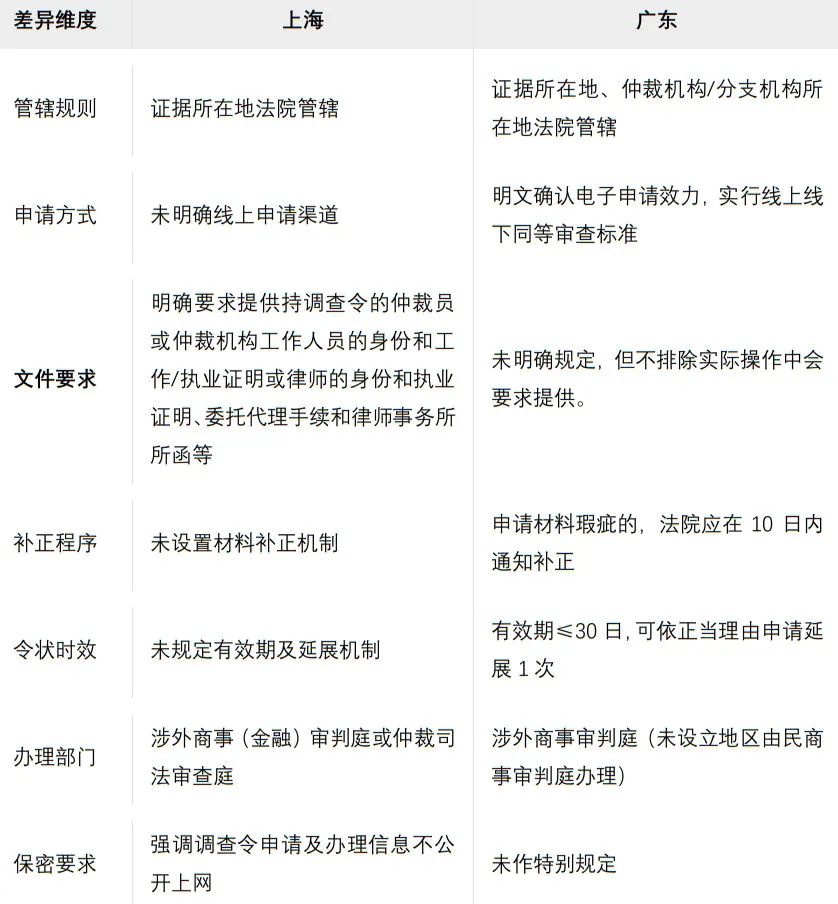沪粤两地作为司法改革前沿,通过创设“仲裁调查令”制度予以制度性回应。2023年11月上海市高级人民法院出台《上海市高级人民法院关于开具调查令协助仲裁调查取证的办法(试行)》。广东省高级人民法院则在2025年6月19日,印发《广东省高级人民法院关于开具调查令协助商事仲裁机构调查取证的办法(试行)》,对调查令的适用范围、申请条件等作出详细规定,为解决仲裁调查取证难题提供了切实可行的路径。