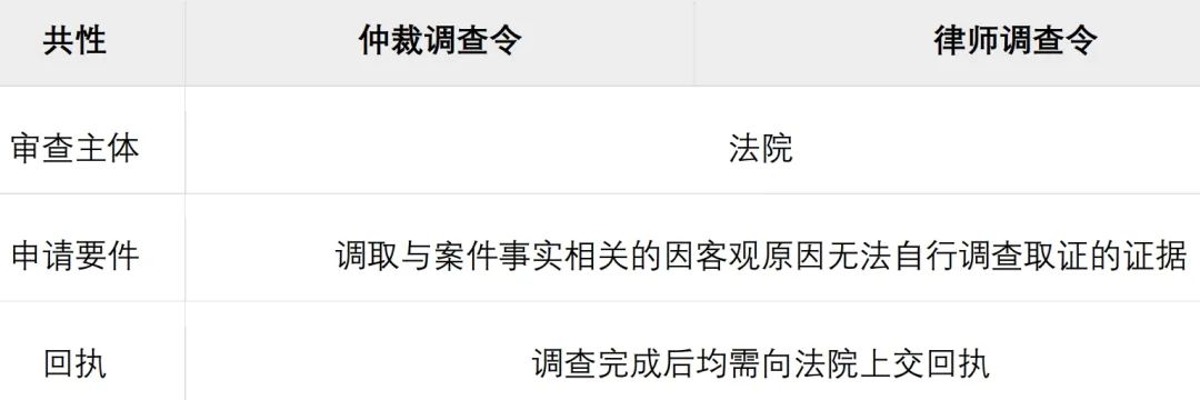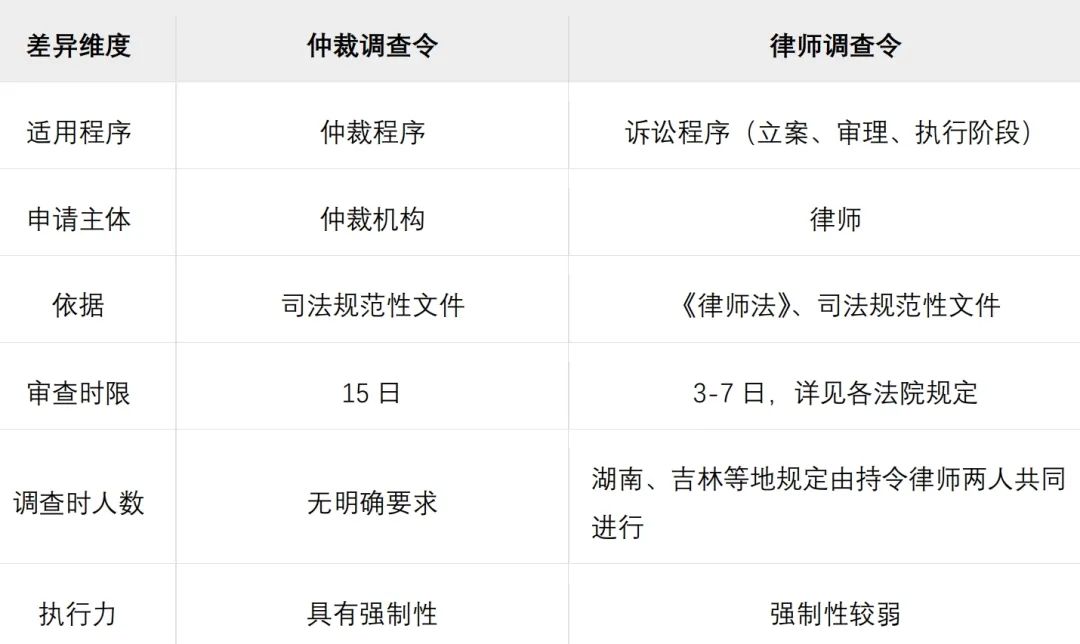 面对“调查取证难”这一司法实践中的共性难题,仲裁调查令制度并非首创。其制度逻辑与作为重要先导的律师调查令制度一脉相承——两者均通过赋予特定主体更强的取证权限来破解这一困境。我们将两者对比如下: